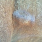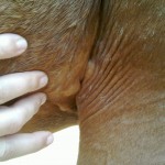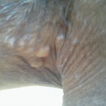 The lumps are behind Isis’ front legs right in front of the girth. The lumps appear to be only in the skin: I can move the lumps easily around. They feel mostly hard and small. The lumps are not uniform in shape. The one on Isis’ right side is long and tube-shaped, while the ones on the left side are like clustered pearls.