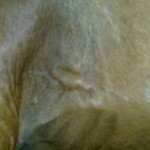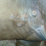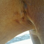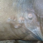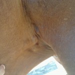 Isis has always had skin issues: rain rot, fly bite allergies, scratches, etc. For the most part, these things last a little while, are treated, and then resolve. For the past two months or more, Isis has had lumps under her legs, right where the girth goes. Initially, the lumps did not interfere with the position of the girth. The lumps were slightly in front. However, wearing the girth irritated the lumps.